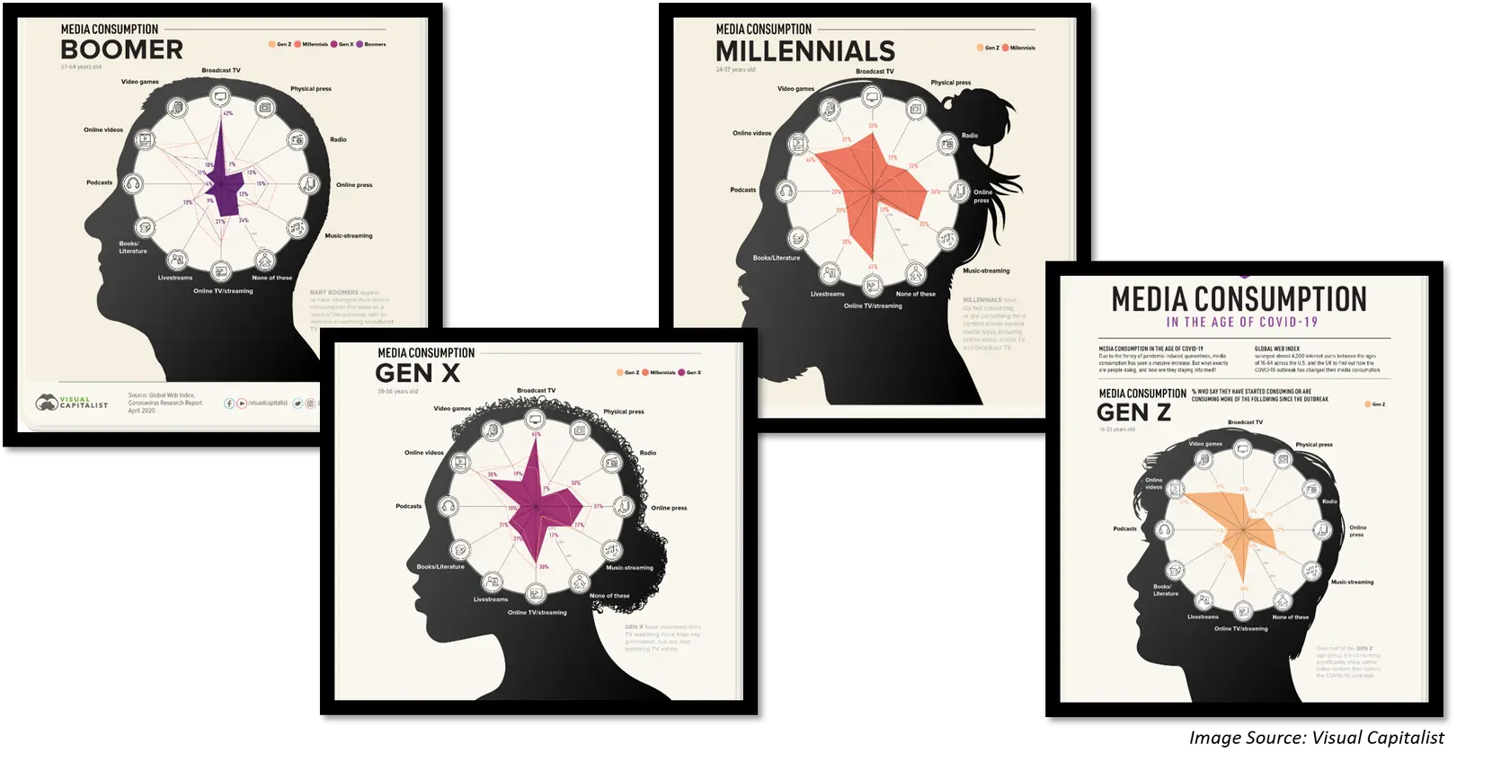 These technological influences are reflected in some recent research by Global Web Index, when they looked at media consumption during the coronavirus pandemic of 2020. The results have been beautifully captured in infographic form by Visual Capitalist.
