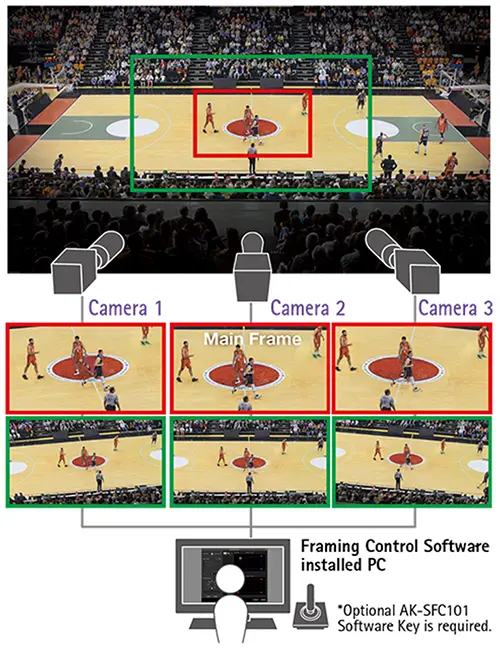 Several 8K Multi-Purpose Camera units (maximum of 8) can be connected and operated as one integrated system. By setting one crop area in the main frame and linking it to other crop areas, pan, tilt and zoom on the multiple crop images operate in link with the panning, tilting and zooming on the main frame. This allows improving operational efficiency in multi-camera/multi-angle recording or broadcasting. Multiple frames can be controlled using Framing Control Software*