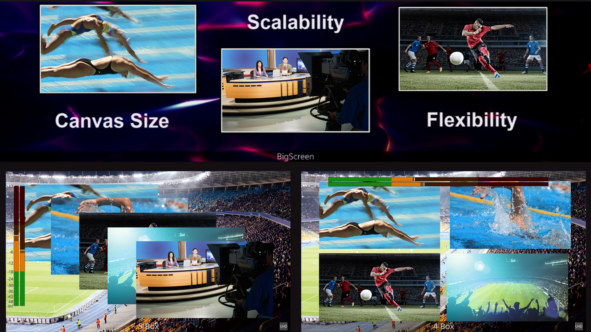 Input/output functions of KAIROS has been expanded and strengthened by the "Agile Input Routing" feature that flexibly allocates GPU I/O capability according to the bandwidth of video source.