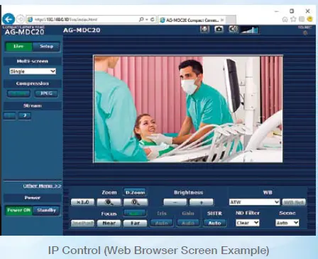 - IP control: Remote control from a PC, tablet or IP controller enables Rec Start/Stop, Clip Delete, and compact Camera Head control (Zoom, Focus, Iris, and Menu Settings).